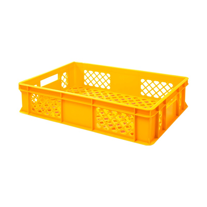 Niskie skrzynki plastikowe kosze na pieczywo H-140 żółte. Skrzynka ażurowa pozwala na utrzymanie świeżości pieczywa zarówno w piekarni jak i w sklepie.
